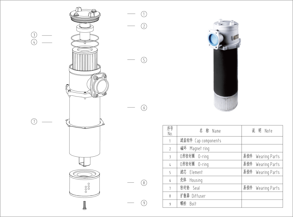 过滤器内部的磁铁可吸附滤介质中的铁质污染物,适用于各种液压油。